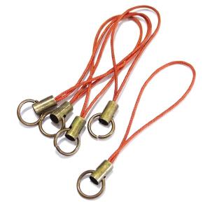 3387-《ストラップ/根付》 赤茶(紐)/真鍮古美(金具) 丸カン付き 50mm前後 5本/1セット