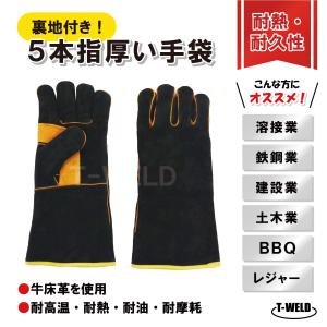 溶接 鉄鋼 建設 耐熱 作業用 牛革素材 5本指 ロング 手袋 長さ L:50cm 厚い手袋裏地付 黒色 サンプル 1双 BBQ