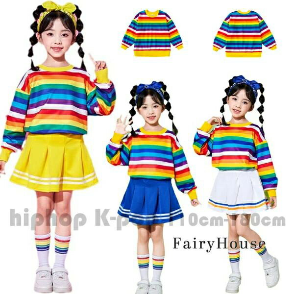 キッズ ダンス衣装 女の子 虹色 ストライプ柄 スウェット 運動会 応援団 発表会 小学校 クラス活動 キッズダンス 長袖 トップス かわいい スウェット 青スカート 白スカート 黄スカート ラムショー 公演服 運動会 大人気 体育祭 文化祭 学園祭 110-180