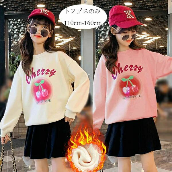 子供服 女の子 スウェット 裏起毛 トレーナー 防寒抜群 冬服 キッズ 長袖 スウェット チェリー柄 ピンク ページュ トレーナー 暖かい かわいい 姉妹 双子 スウェット レジャー トレーナー 丸首 モコモコ 温かい 衛衣 トップス 冬着 110 120 130 140 150 160