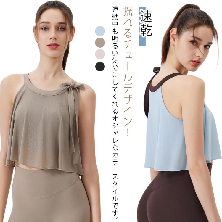 カップ付き かわいい ヨガウェア ノースリーブ ピラティス キャミソール ランニング 体型カバー リボン トップス ホットヨガ スポーツウェア チュール 揺れる おしゃれ S M L XL