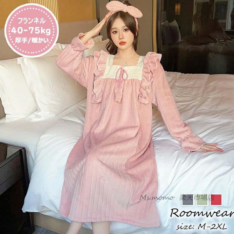 ルームウェア レディース ネグリジェ パジャマ 部屋着 もこもこ 秋冬 ワンピース 冬 裏起毛 着る毛布 冬 ガウン モコモコ 長袖 リボン付き