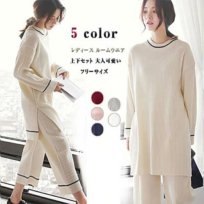 ルームウェア レディース パジャマ 部屋着 セットアップ 長袖 長ズボン 上下セット 全5色 フリーサイズ 春 秋 丸襟 プルオーバー ワンマ