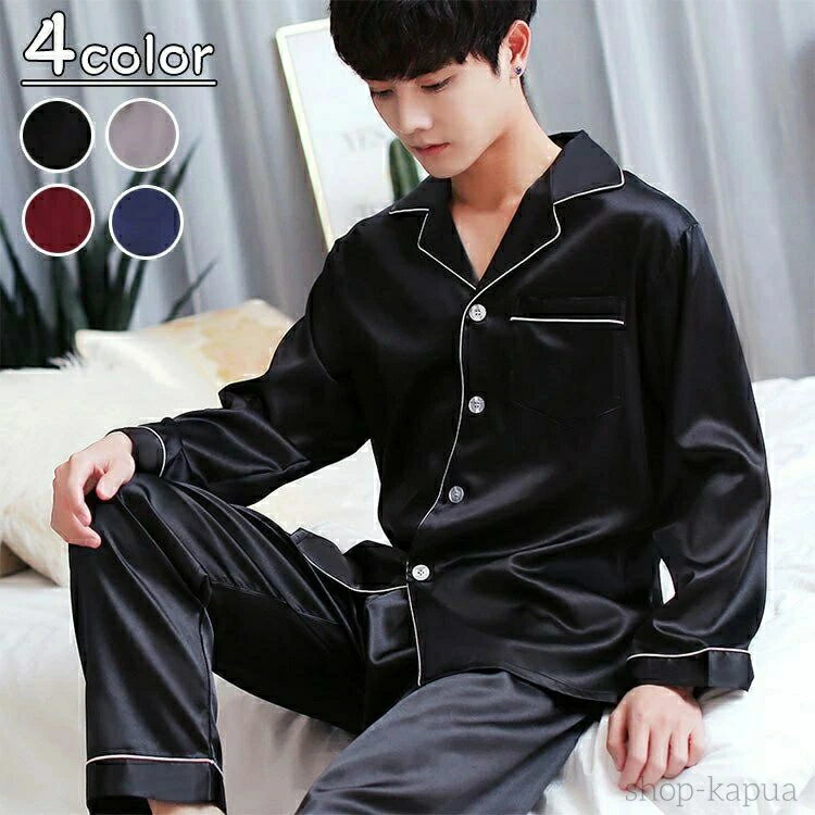 ナイトウェア パンツ ロング シャツ 長袖 ルームウェア 襟付き 部屋着 サテン シルク調 秋 夏 春 半袖 長袖 メンズ セット 上下