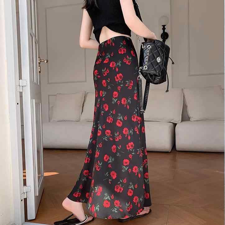 スカート レディース 春夏 Aラインスカート ロングスカート 花柄 ポリエステル 高腰 スリット入り エレガント 通勤 赤