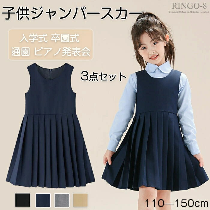 ジャンパースカート 子供 女の子 3点セット フォーマルワンピース キッズ きちんとした 可愛い 春秋 無地 重ね着風 普段着 お出かけ 洋服 学生服 学園風 通学 通園 発表会 卒業式 入学式 結婚式 黒 110cm 120cm 130cm 140cm 150cm