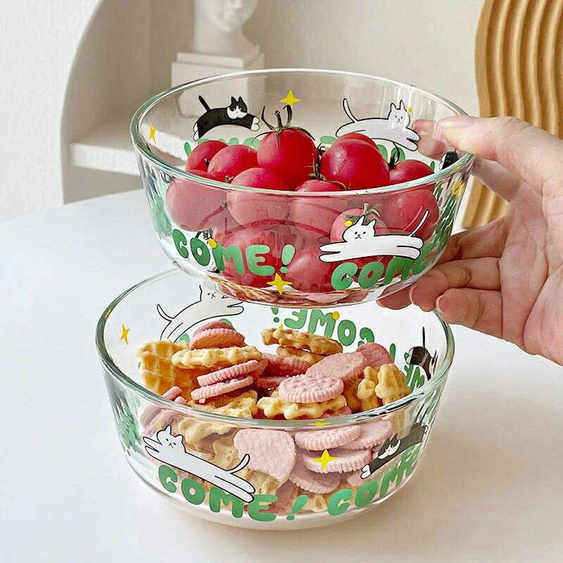 耐熱透明ガラスボウル、電子レンジ対応ガラスサラダボウル、耐熱フルーツデザートボウル、手持ちガラスオートミールボウル、厚みのある鮮度保持ガラス朝食ボウル、高付加価値透明ガラスサラダボウル、猫型ガラスボウル、軽量サラダボウル