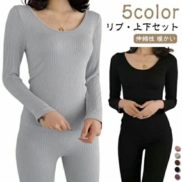 リブ 長袖 保温 インナー レディース 上下セット 5色 肌着 ルームウエア 伸縮性 暖かい パンツ レギンス 防寒 冷え防止 パジャマ