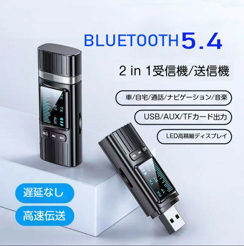 Bluetoothアダプター 5.4 受信 送信 2-in-1 車載 家庭用 USB AUX TFカード再生 ワイヤレスオーディオトランスミッター レシーバー ハンズフリー通話 高音質 遅延ゼロ 10m伝送 スマートチップ搭載 LEDディスプレイ コンパクト 多機能 ノイズキャンセリング 音楽