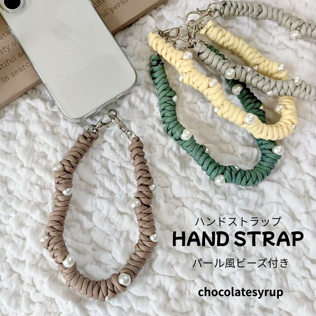 メール便 限定 送料無料 ★ ハンドストラップ くすみカラー パール ビーズ 付 ★ スマホストラップ おしゃれ 可愛い パラコード ストラップ イミテーションパール ネオンカラー ラメ スマートフォン チョコレートシロップ