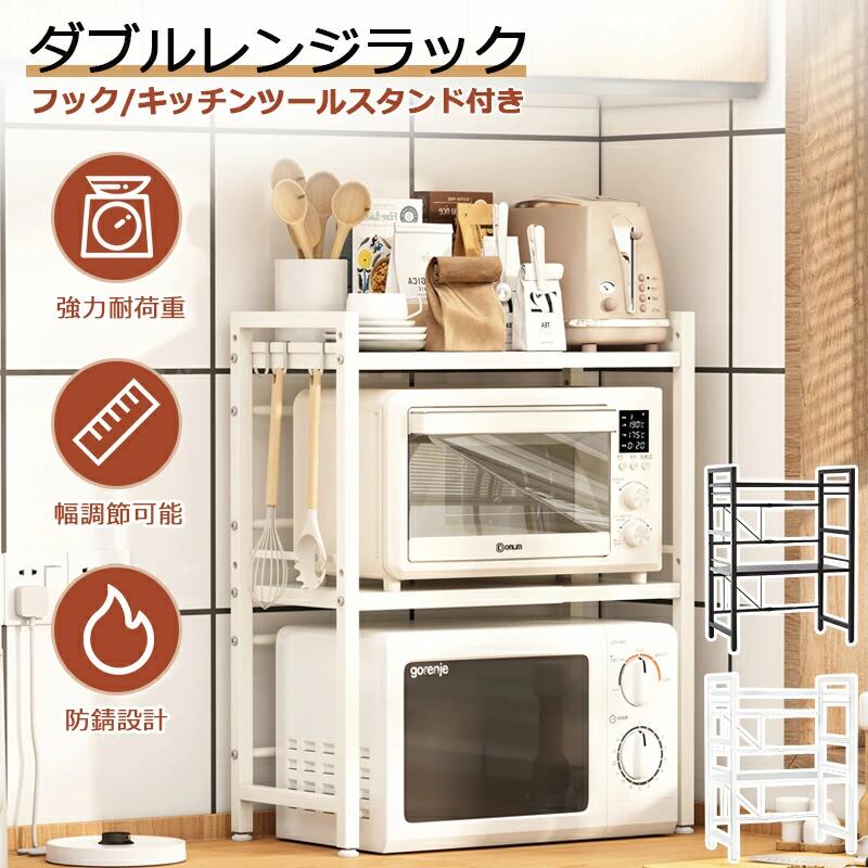 レンジ上ラック 二段 電子レンジラック レンジ台 伸縮式 幅(44~64cm) 棚板高さ調節可 耐荷重75kg 2段式 キッチン収納棚 フック付き 組立簡単 ステンレス製 高さ調節可能 収納 レンジラック スリム 耐熱 送料無料