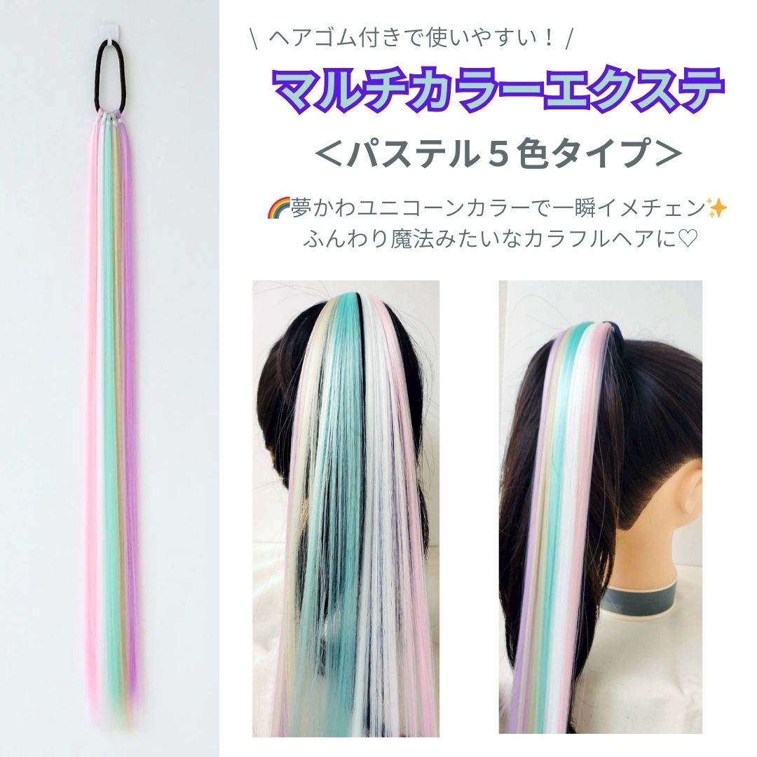 ヘアエクステンション パステルカラー ユニコーン 可愛い 5束 ヘアゴム付き ダンスアクセ ツヤ加工 時短 簡単
