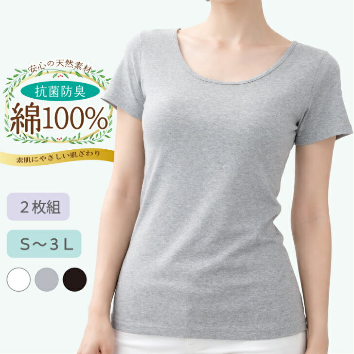 【2枚組】 綿100% 半袖インナー レディース 婦人 綿 コットン 肌着 下着 インナー トップス 半袖 抗菌防臭 シロ/クロ/グレー S-3L 16691