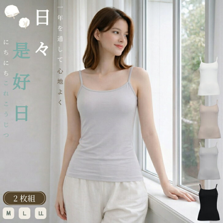 【2枚組】 キャミソール レディース 綿混 柔らか 超長綿 無地 カジュアル 通年対応 ストレッチ 婦人 肌着 下着 ベージュ/オフホワイト/グレー/クロ M-LL 16174