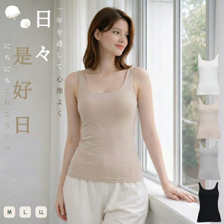 カップ付き タンクトップ レディース 綿混 柔らか 超長綿 無地 カジュアル 通年対応 ストレッチ 婦人 ブラトップ カップ付きインナー インナー 肌着 下着 ベージュ/オフホワイト/グレー/クロ M-LL 16723