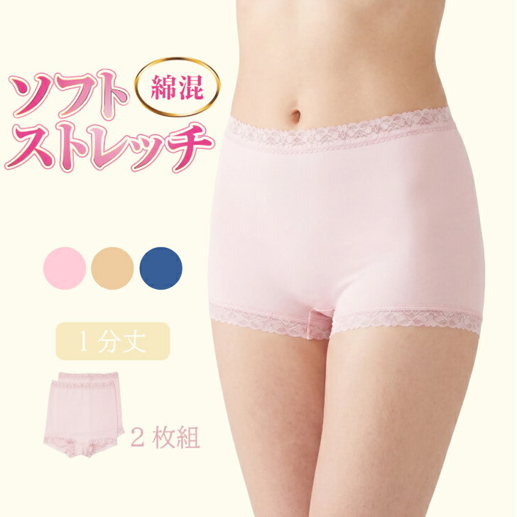 1分丈ショーツ 2枚組 レディース 綿混 ストレッチ フィット レース ショーツ 1分丈 婦人 ミセス ピンク/コン/モカ M-LL 13085