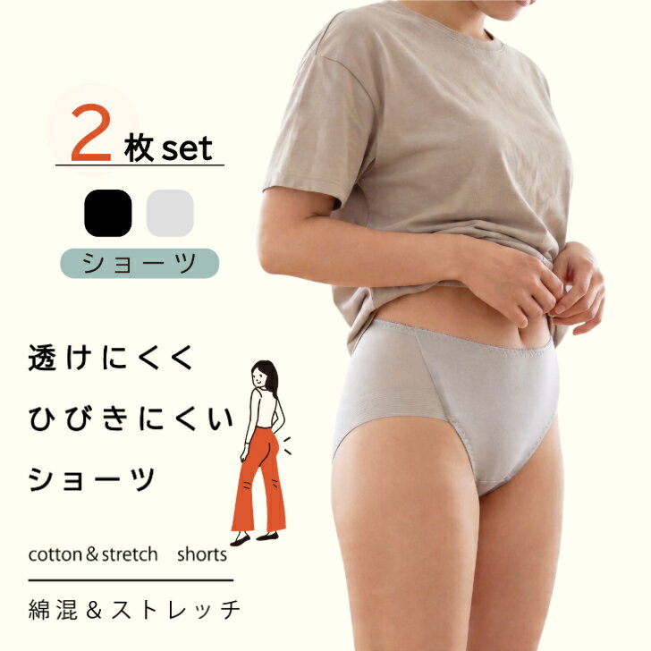 ★春のセール 20%OFF 5/6まで★ 【2枚組】 ヘム1分丈 レディース 綿混 ヘム ストレッチ ひびきにくい 透けにくい すっきり ショーツ 下着 女性 グレー/クロ M-LL 14021