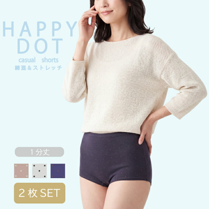 ★春のセール 20%OFF 5/6まで★ 【2枚組】 ドット柄1分丈 レディース 綿混 ストレッチ シンプル カジュアル ジャガード ドット柄 ショーツ 下着 パンツ 女性 ブラウン/コン/グレー M-LL 14015