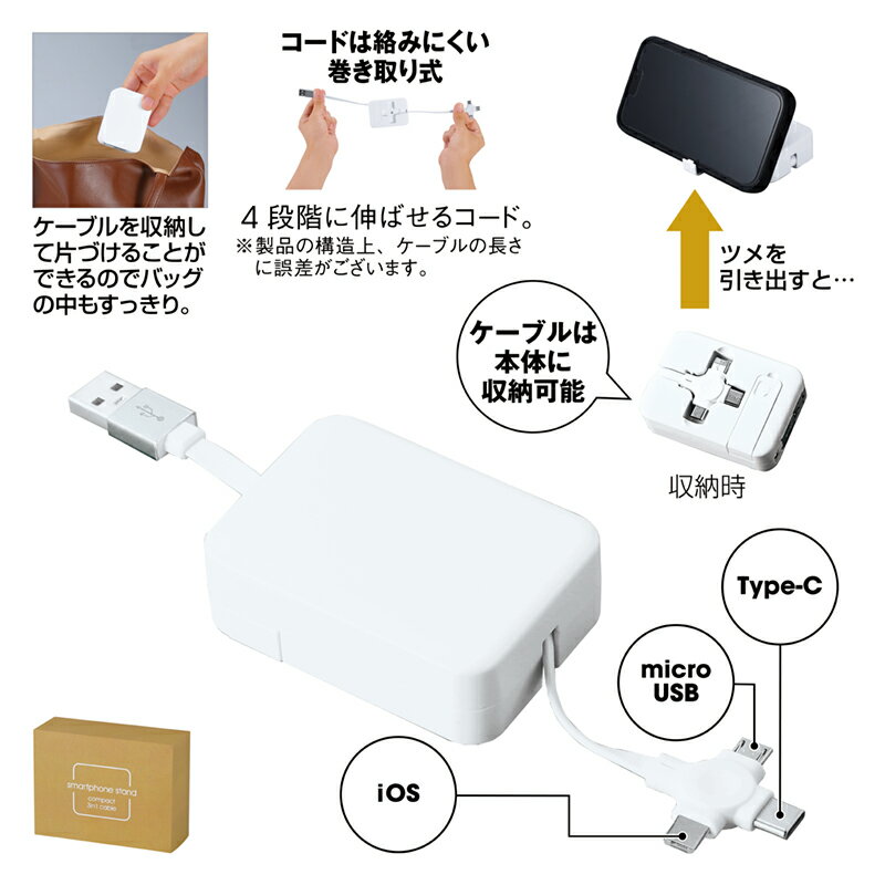 237001 スマホスタンドになるケーブルホルダー(3in1 ケーブル付き)3種のUSBコネクタ付いケーブルがセットになったケーブルホルダー贈り物 プレゼント 記念品