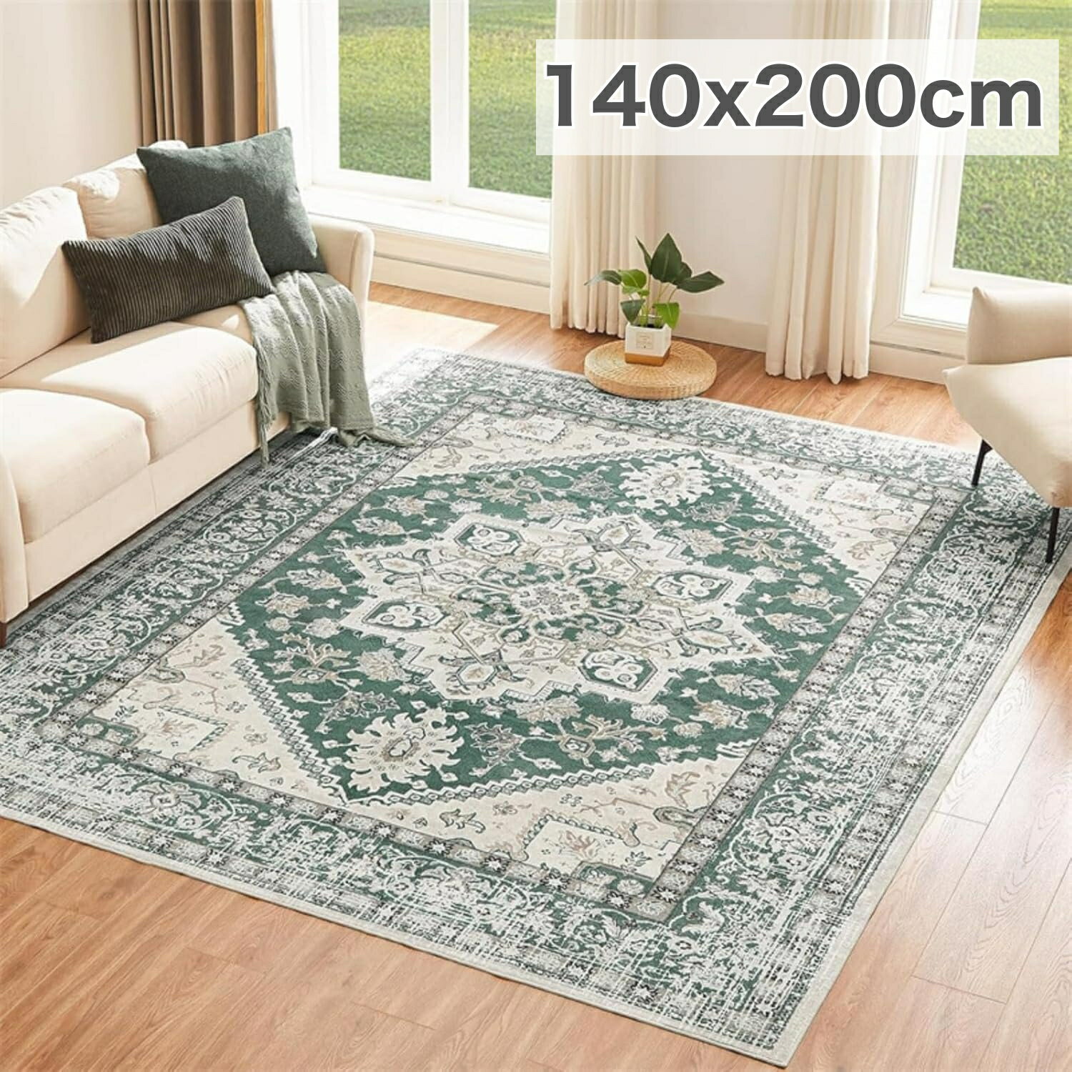 【新品】 洗える ペルシャ絨毯風 ラグ 140x200cm 2畳 緑 カーペット 花柄 滑り止め付き オールシーズン 防ダニ 防臭 床暖房対応 マイクロファイバー 折り畳み可能 玄関マット リビング ベッドルーム 洗濯機対応 高密度