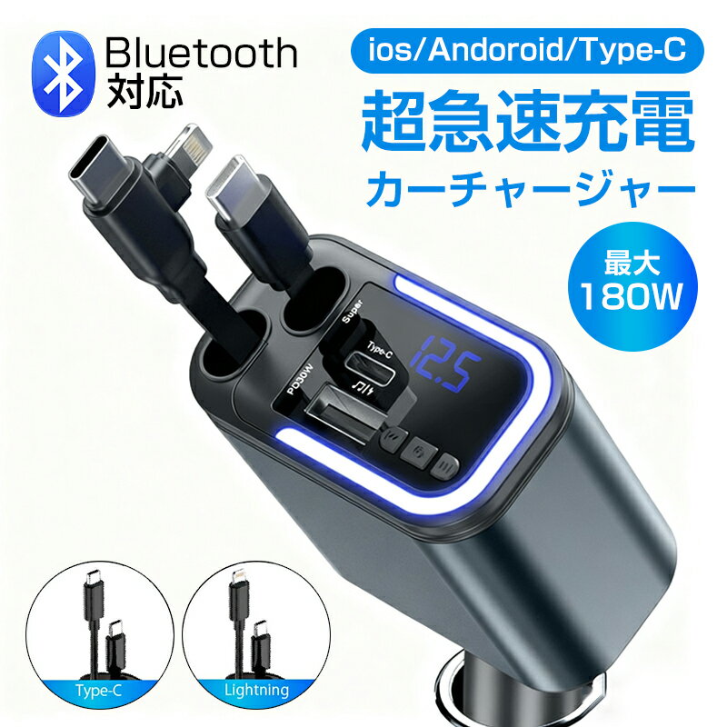 【巻き取り式】カーチャージャー 急速充電 シガーソケット 車載充電器 Bluetooth対応 音楽再生 伸縮ケーブル 充電ケーブル 120W 180W 車 急速充電器 Type-C Lightning 5台同時充電可能 LED表示電圧 スマホ アイコス イルマ カーシェア usb 出張 自走 家族 グループ 旅行