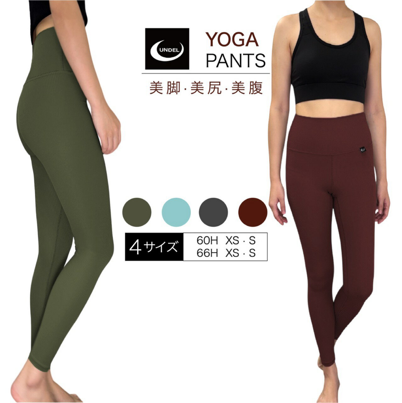 UNDEL ヨガパンツ レディース リブ レギンス ハイウエスト 4WAY ストレッチ ヒップアップ 体型カバー 無地 吸汗速乾 美脚 美尻 やわらかフィット XS〜S 60H/66H