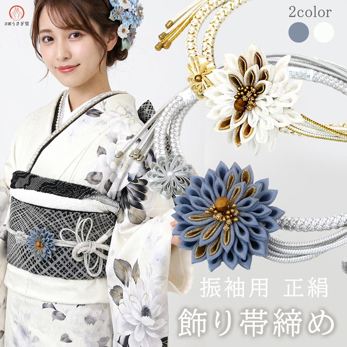 正絹 飾り帯締め 振袖 成人式 oj-104-k つまみ細工 つまみ花 帯締め 青 ブルー 白 ホワイト 花飾り モダン 可愛い 組紐 結婚式 卒業式 お洒落着物 和装 着物