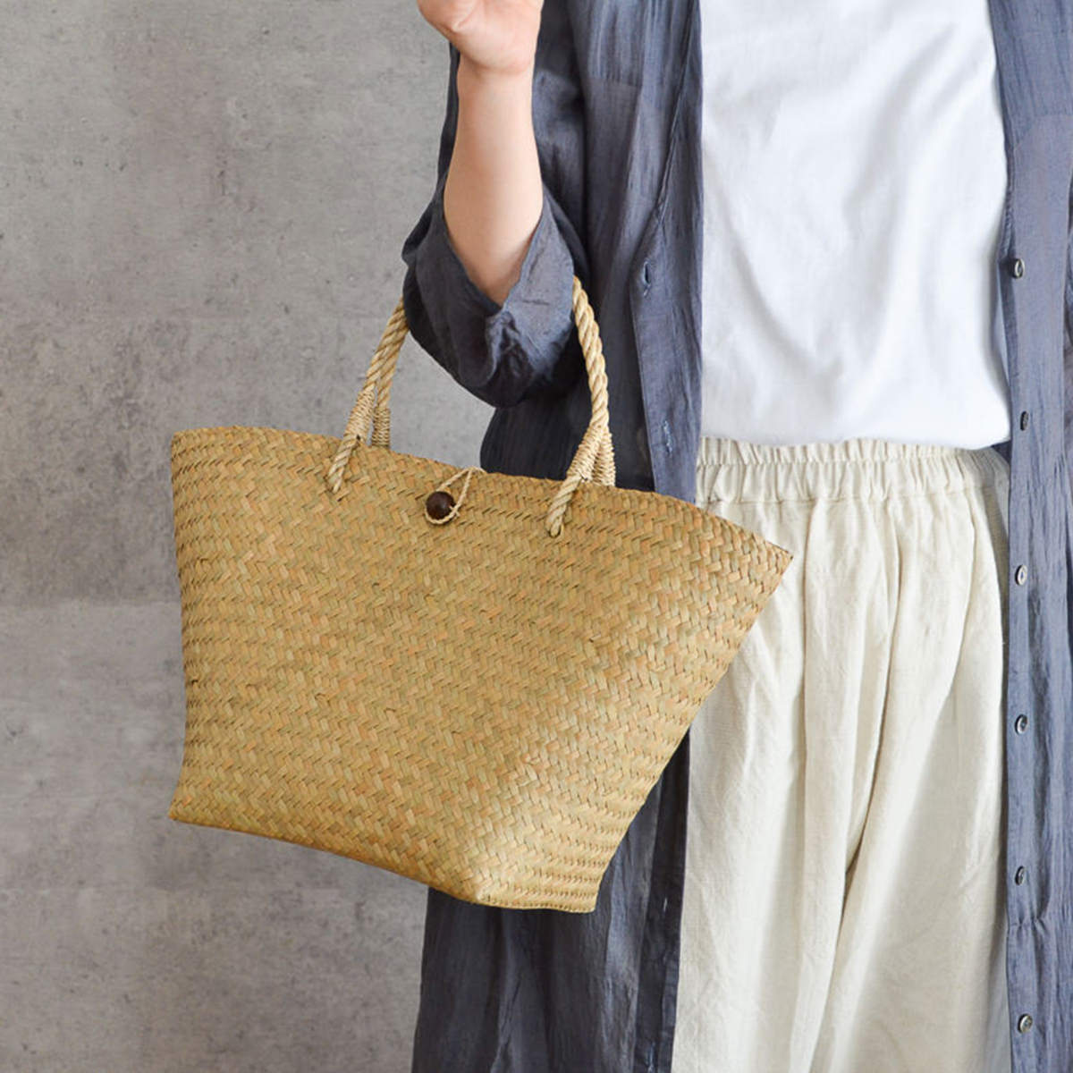 キャリーバスケット 小/大サイズ コック 草製 三つ編み入り 籐ハンドル 持ち手付き 手編み タイ製