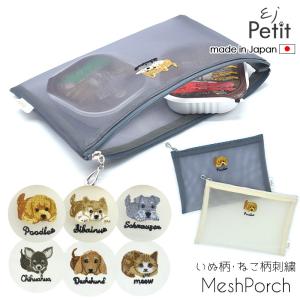 日本製 犬柄刺繍 メッシュ フラットポーチ プードル シュナウザー 柴犬 小物入れ 刺繍入り 化粧ポーチ コスメポーチ マスクケース アーンジョー