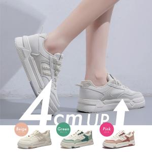 スニーカー レディース カットワーク デザイン インヒールなし 厚底 4cm PU 通気性 シューズ 紐靴 ベージュ グリーン ピンク