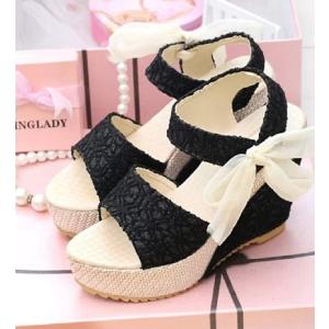 レディース 厚底 ウェッジソール サンダル レース 花柄 切替 リボン プラットフォーム ヒールサンダル オープントゥ /全3色 春 夏 旅行 リゾート 美脚