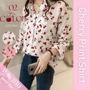 シャツ 長袖 ブラウス チェリー フルーツ 個性派 柄 総柄 柄物 レディース 韓国ファッション フレンチカジュアル ガーリー フェミニン 抜け感