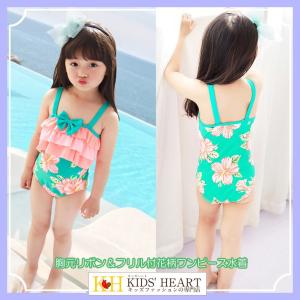 子供水着 胸元リボン&フリル付花柄ワンピース水着 キッズ かわいい 女の子 花柄 グリーン ピンク メール便送料無料 売れ筋 新商品