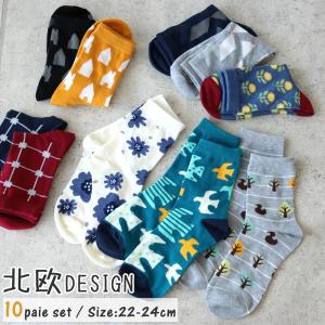 靴下 レディース 北欧デザイン クルー丈ソックス 10足セット 22-24cm カラフル 花柄 鳥