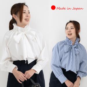 「日本製」 ブラウス ビッグリボン 入学式 卒業式 ビッグボウブラウス レディース 立ち襟 フォーマル セレモニー 白 ホワイト ストライプ スーツ インナー