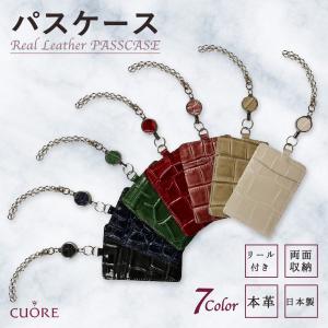 パスケース レディース おしゃれ リール付き 本革 クロコ 7色 型押し 定期ケース 定期入れ ICカードケース プレゼント お祝い