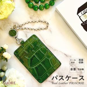 パスケース レディース おしゃれ リール付き 本革 クロコ 緑 ユニセックス 型押し 定期ケース 定期入れ ICカードケース プレゼント お祝い