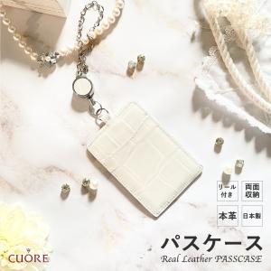 パスケース レディース おしゃれ 上品 シンプル かわいい リール付き 本革 クロコ 白 開運 ホワイト型押し 定期ケース ICカードケース プレゼント お祝い