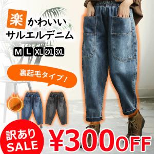 暖かい 裏起毛 デニム サルエルパンツ レディース デニムパンツ 大きいサイズ スラウチ 腰周り ゆったり ぽっちゃり 個性派 バルーン セール あすつく 即納