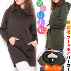 フード ボア 裏起毛 パーカー チュニック 長袖 ポケット付き 身幅ゆったり 無地 秋冬 ビッグ 大きいサイズ BIG M L LL 3L 4L 3669