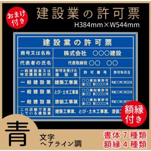 建設業の許可票 青色 書体7種類・フレーム4種類 屋内用 法定サイズクリア ヘアライン仕様 384mm×544mm ブルー 看板製作