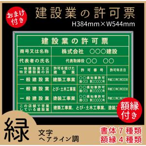 建設業の許可票 緑色 書体7種類・フレーム4種類 屋内用 法定サイズクリア ヘアライン仕様 384mm×544mm グリーン 看板製作