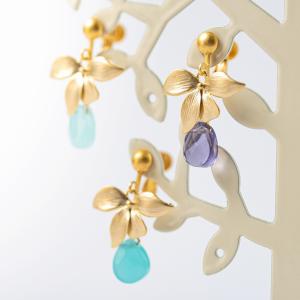 ハワイ オーキッド イヤリング 天然石 マットゴールド 水色 紫 アメジスト ネコポス発送
