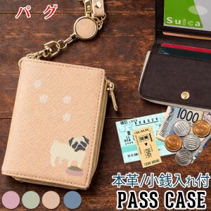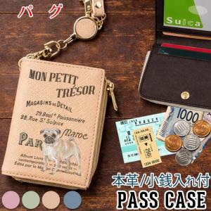 パスケース 本革 リール付き 定期入れ 二つ折り 【 パグ 】 犬 レディース 入学祝い 就職祝い プレゼント おしゃれ 2枚 ICカードケース 東京アンティーク