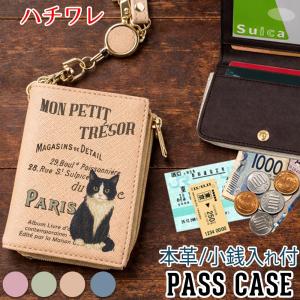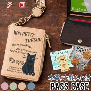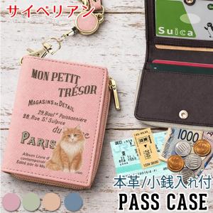 パスケース 本革 リール付き 定期入れ 二つ折り 小銭入れ 【 サイベリアン 】猫 ヴィンテージキャット レディース プレゼント おしゃれ 東京アンティーク