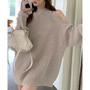 オープンショルダーニットワンピース ミニ丈 レディース ショルダーカット セクシー 肌見せ ニットセーター ハイネック リブニット ゆったり