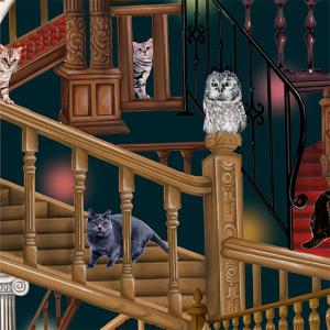 猫柄生地 nora. ネコとフクロウの館 (50cm単位)