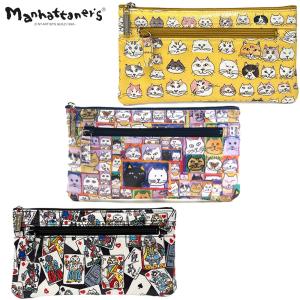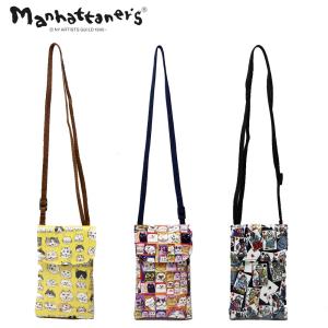マンハッタナーズ マルチ スマホポーチ 縦型ポシェット[ぎっしり猫顔/猫社会/猫のカード遊び]日本製 PVC スマホショルダー