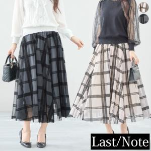スカート ロング丈 チェック柄 フレアースカート レース チュール ウエストゴム 透け感 大人 skirt