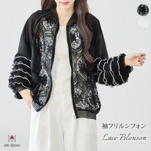 レース シアー ブルゾン レディース ジャケット 羽織 ボリューム袖 フリル シフォン 配色 長袖 アウター フラワー 花柄 シアー カーディガン